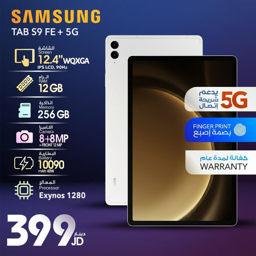 اكتشف تابلت Samsung Tab S9 FE 5G بشاشة 12.4" WQXGA IPS LCD بمعدل تحديث 90 هرتز، أداء قوي وذاكرة 12 جيجابايت رام مع تخزين داخلي 256 جيجابايت، متوفر الآن في...